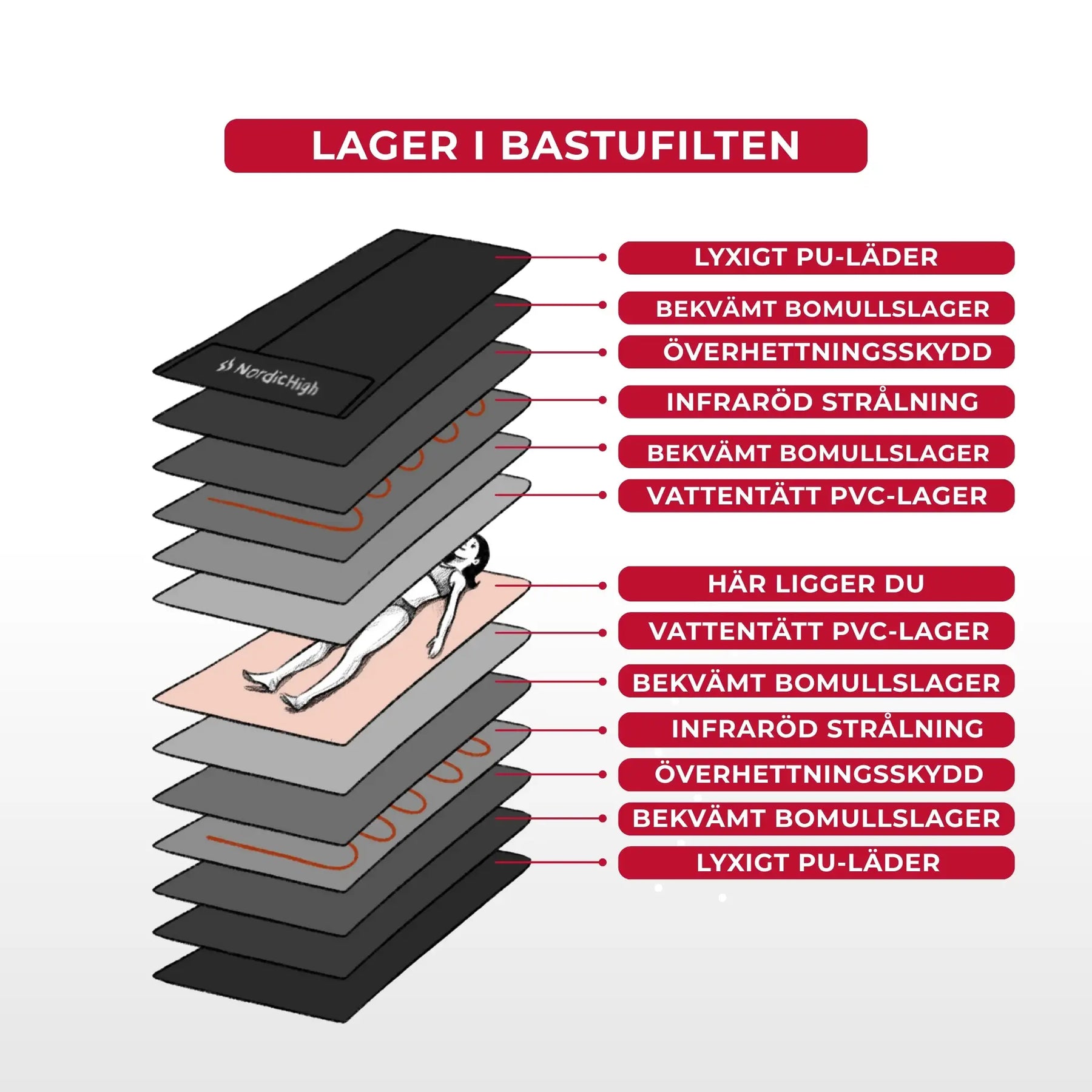 En infraröd bastufilt värmer kroppen inifrån med hjälp av infraröda strålar, medan en traditionell bastu värmer upp luften runt kroppen. Detta resulterar i en mer behaglig och mildare värmeupplevelse i den infraröda bastufilten.