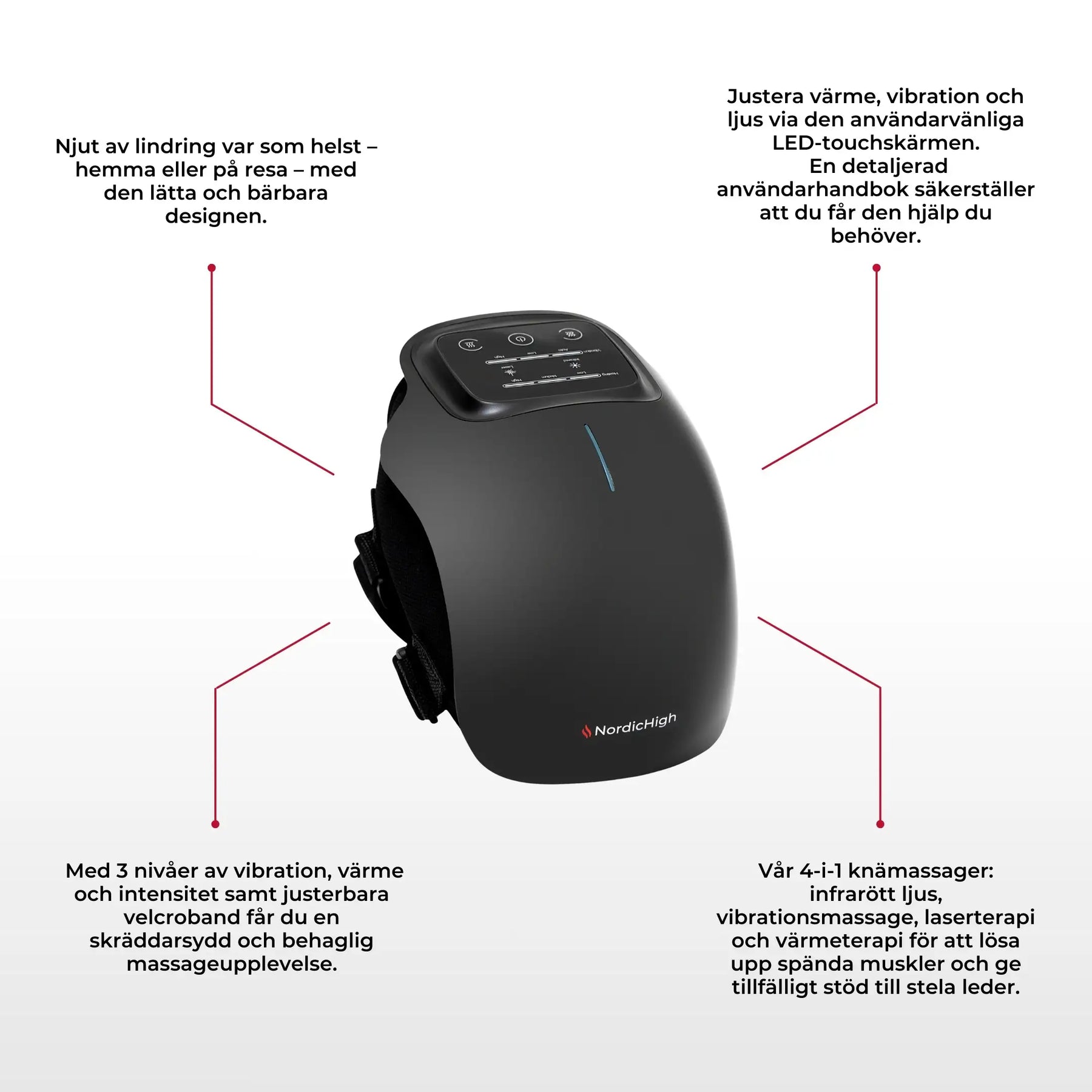 Den djupgående behandlingen kombinerar infraröd värme, vibration och laserterapi för omedelbar lindring, vilket gör den till en oumbärlig del av din dagliga egenvård. Med sin användarvänliga design är knävärmaren lätt att använda – placera den bara runt ditt knä, välj inställning och njut av en avslappnande behandling.