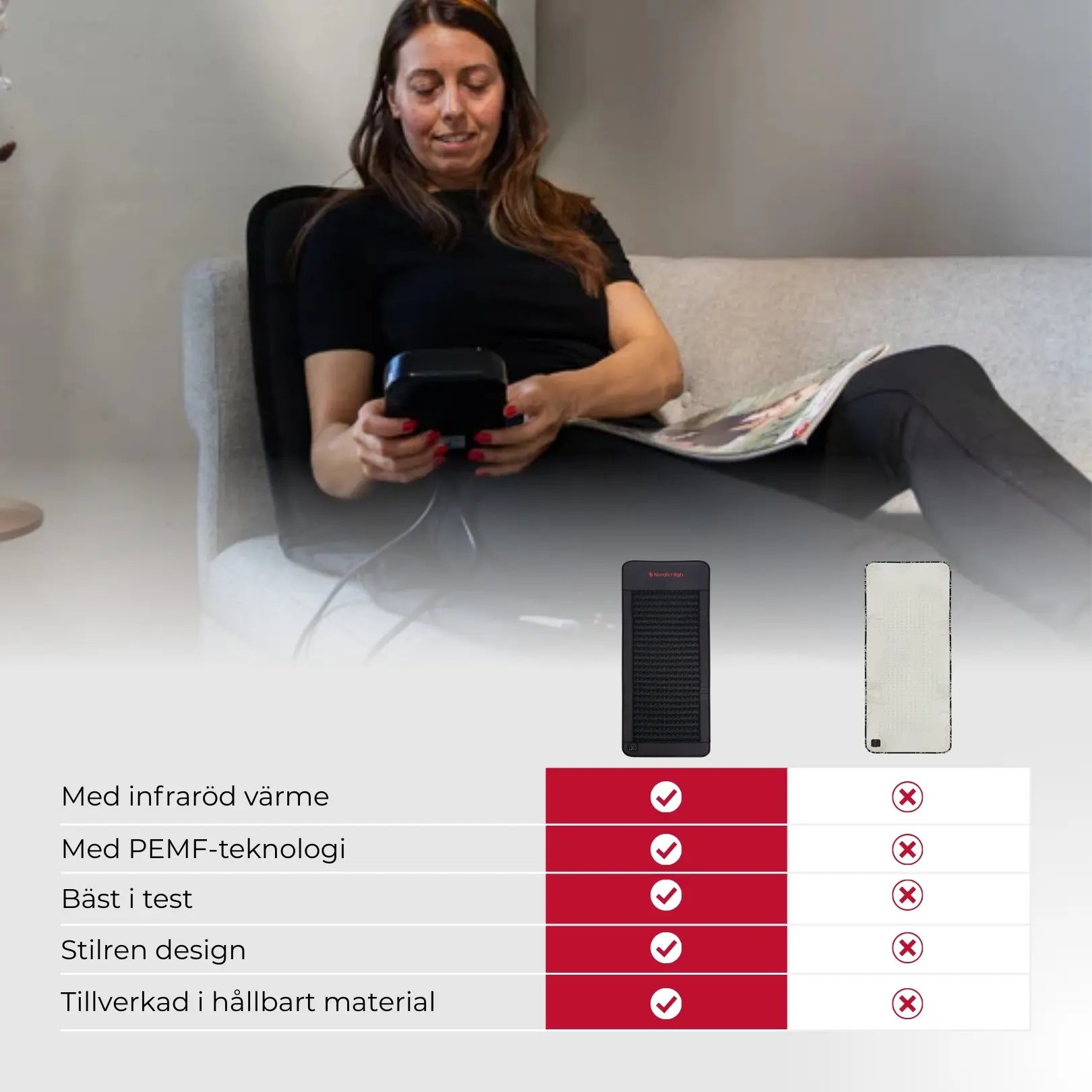 Den infraröda PEMF-madrassen från NordicHigh kombinerar två kraftfulla teknologier: PEMF och infraröd strålning. PEMF hjälper kroppen att återskapa dess balans genom att förbinda den med jordens naturliga magnetfält, och det djupgående värmen från den infraröda strålningen ger bastumadrassen extra fördelar.