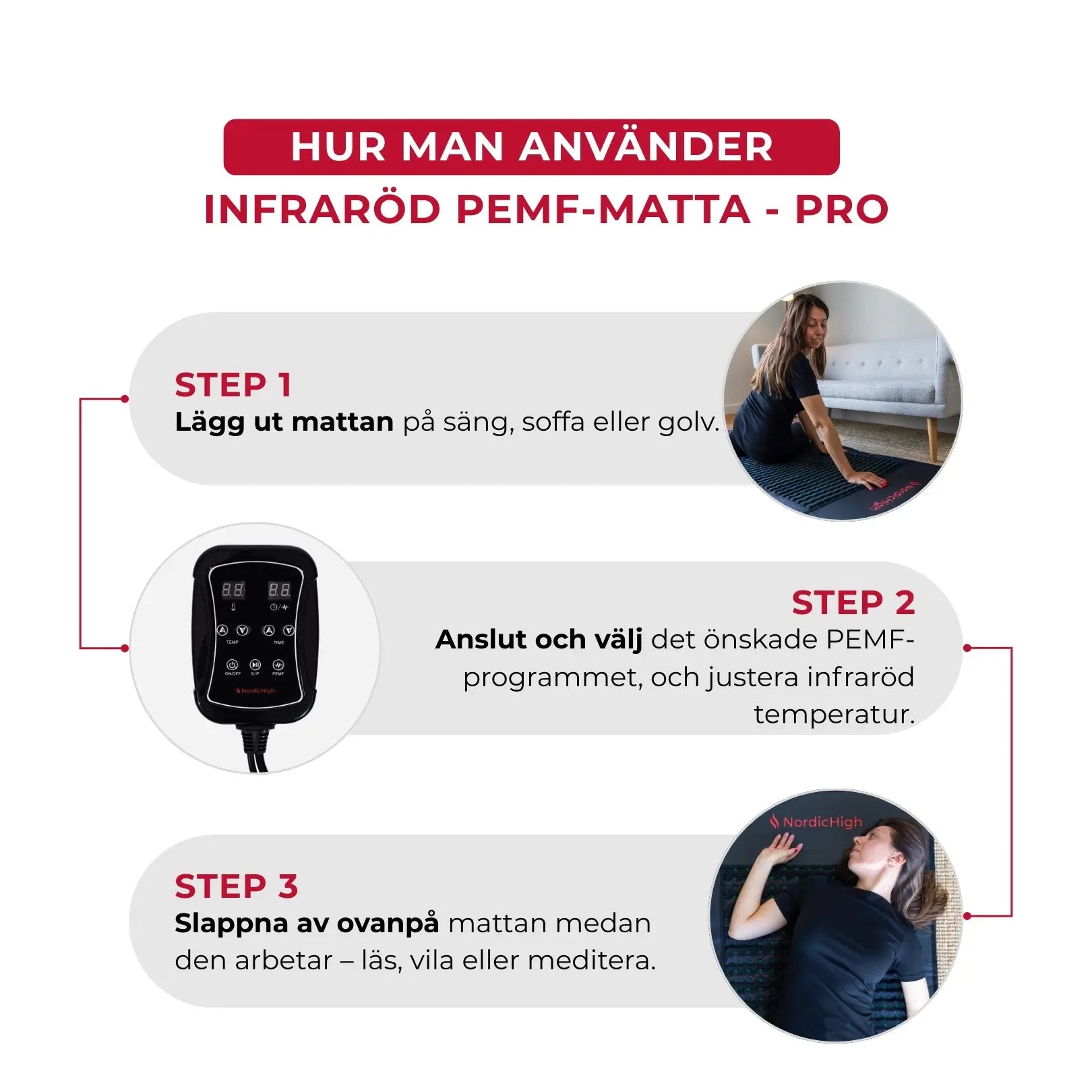 Anslut PEMF-madrassen och välj din föredragna PEMF-inställning och lägg till infrarött ljus för att boosta sessionen.