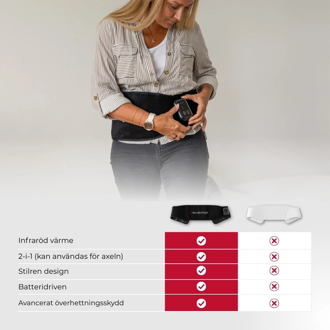 Ett traditionellt värmebälte använder vanlig värme för att lindra ytliga muskelspänningar genom att värma huden och de övre lagren av vävnad. Denna värme ger endast tillfällig lindring och når inte djupt in i kroppen, vilket begränsar effekten på djupare muskler och leder.