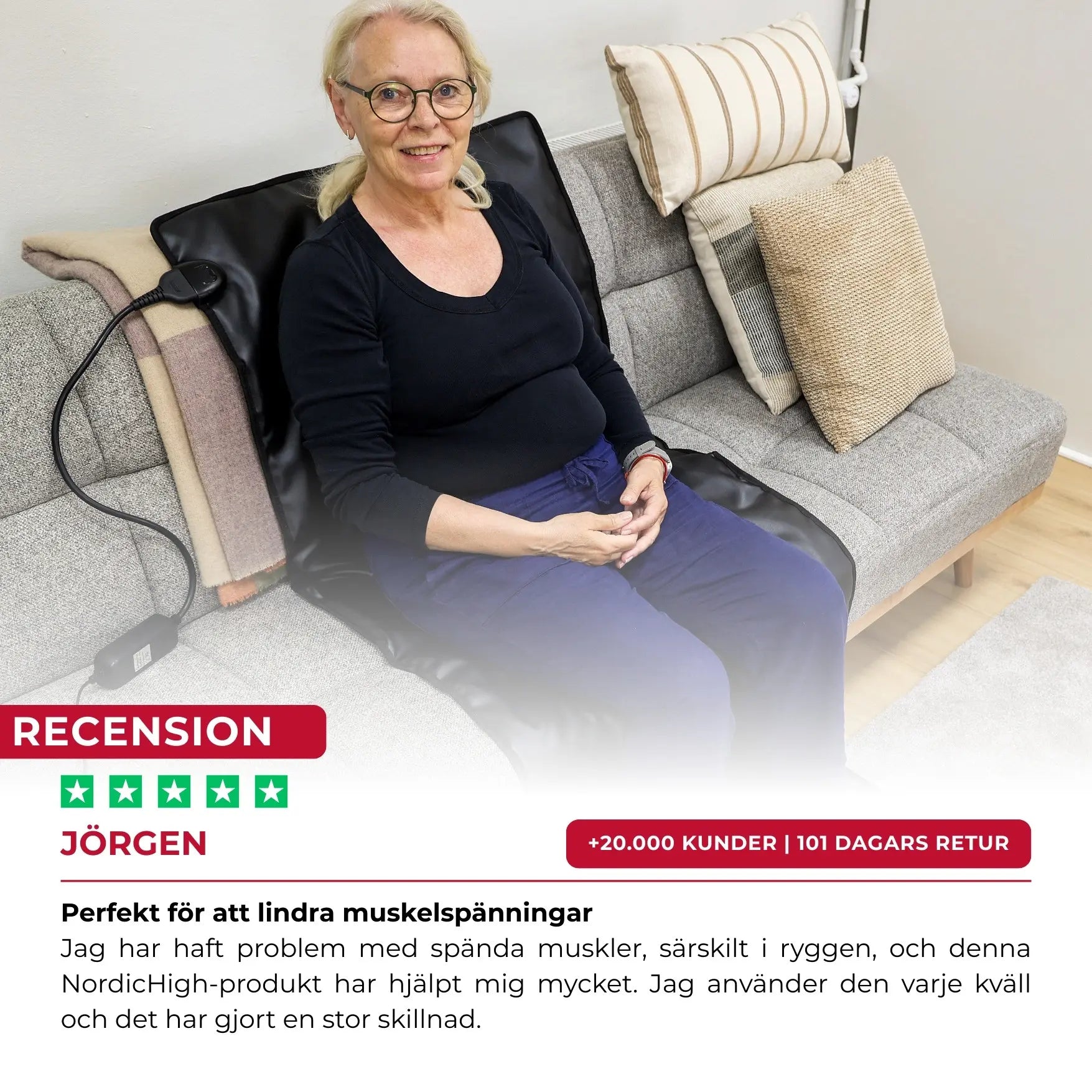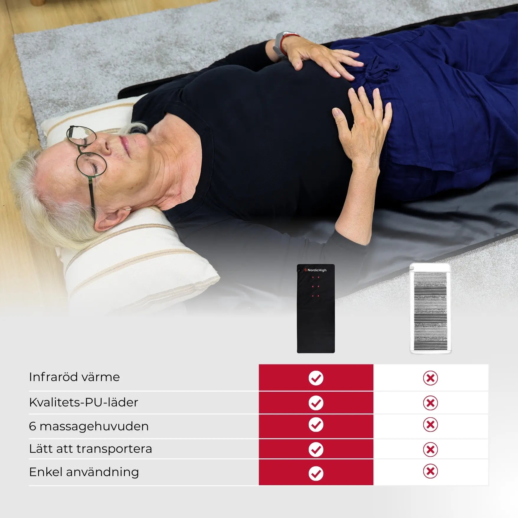 Ge kroppen ro med vår lyxiga värmematta med 6 inbyggda massagehuvuden som arbetar djupt där spänningarna sitter. Kombinerat med lugnande infraröd värme och mjukt PU-läder av hög kvalitet får du en wellnessupplevelse som både lindrar, värmer och skämmer bort – direkt från soffan, kontorsstolen eller sängen.